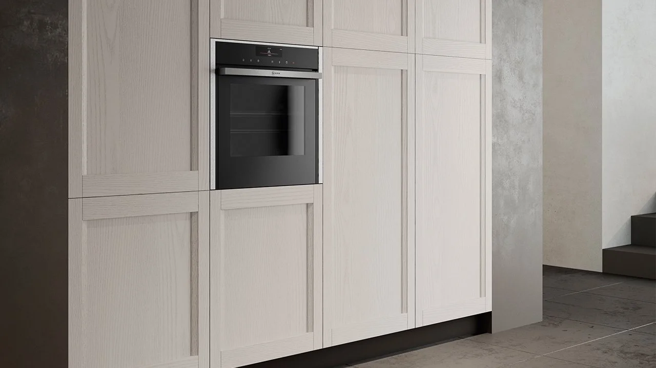 Its solid wood frame doors feature a special integrated handle grip, making it easy to pair with finishes like open-pore lacquer, pickled or wood effects – giving you a wide scope for personalisation.